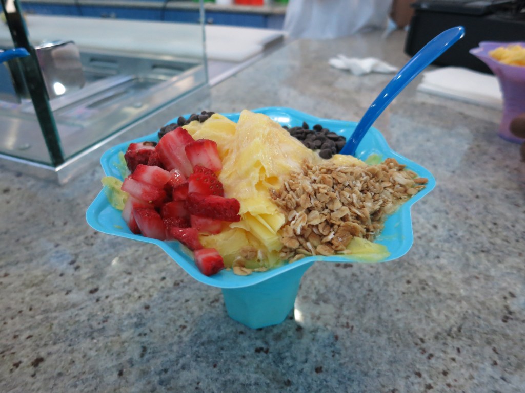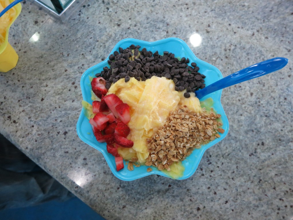My favorite ended up being the Mango-flavored iced-cream. So I ordered. But the best part was yet to come… UNLIMITED TOPPINGS! What!?! So I said lemmegetsum condensed milk, chocolate chips, strawberries, little more choclate chips, granola… Then I paused as the lady tried to squeeze strawberries in the last little pocket left in my cup…. Ok, ok. That’s all.